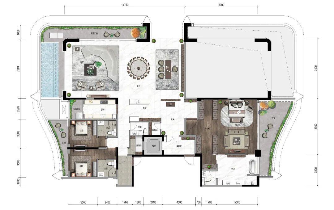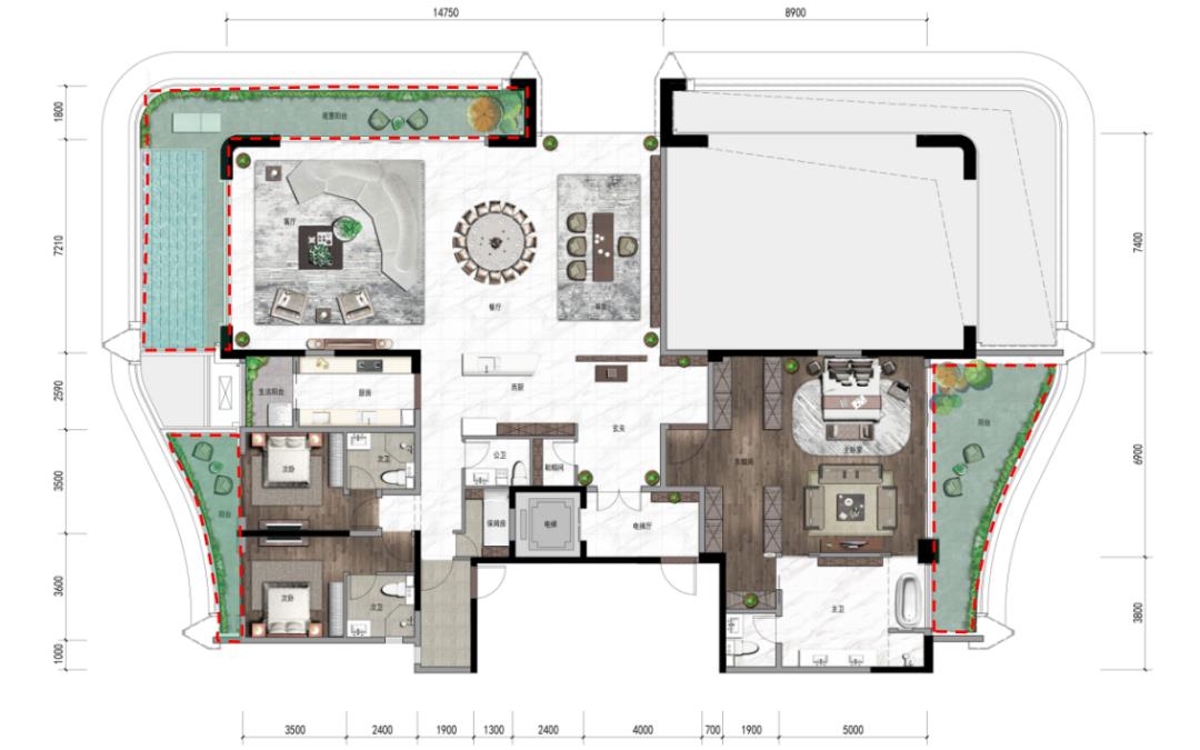 景观是大平层豪宅的主要考虑因素,好风景胜于一切。所以该户型阳台面积总共达到了约80㎡,阳台作为每个房间的延伸空间,实现了室内与城市、自然的无缝对接,保证了室内的采光度,并且可以享受一览无余的视野。