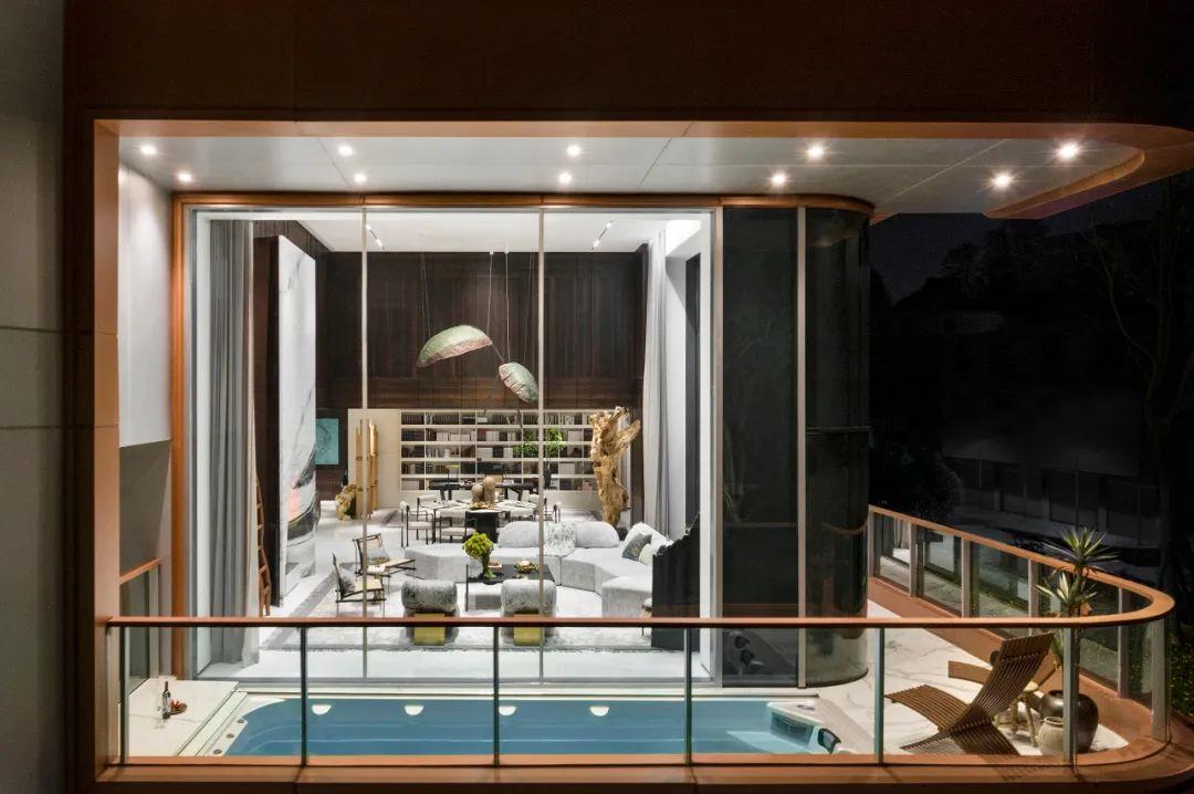 该项目阳台总长度约22.4m,进深约3m,配置面积超过约10㎡的游泳池,这样的尺度,是豪宅大平层才敢有的奢侈。泳池具有恒温加热、杀菌功能、水疗按摩、活水净化、灯光效果等等智能系统,在劳累闲暇之余,于此能够真正的享受生活、放松身心。